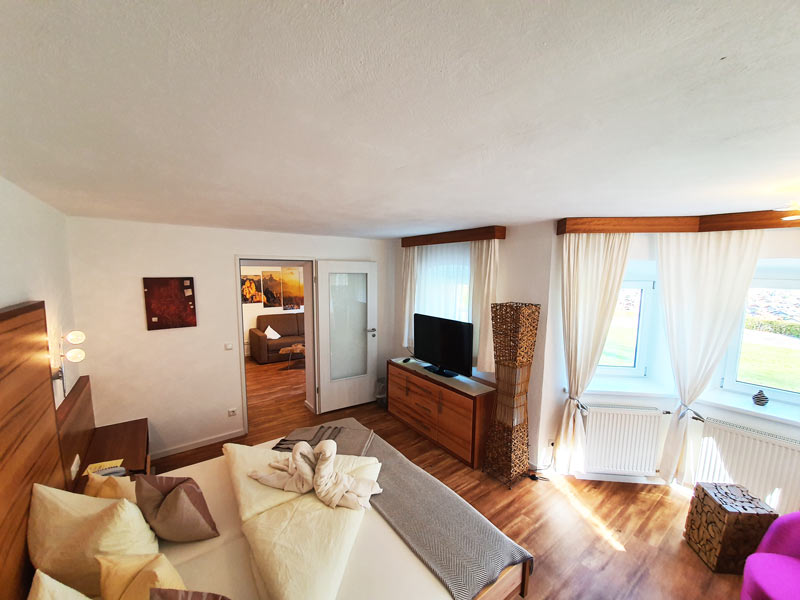 Unsere Suite ist bei den Gästen sehr beliebt und oft über viele Wochen im Voraus gebucht. Das Schlafzimmer ist vom Wohnzimmer mit einer Tür getrennt. Der Erker im Schlafzimmer lädt zum Alpenblick auf den Karwendel ein.