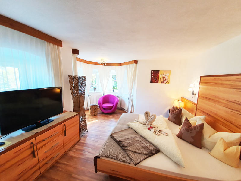 Unsere Suite ist bei den Gästen sehr beliebt und oft über viele Wochen im Voraus gebucht. Das Schlafzimmer ist vom Wohnzimmer mit einer Tür getrennt. Der Erker im Schlafzimmer lädt zum Alpenblick auf den Karwendel ein.